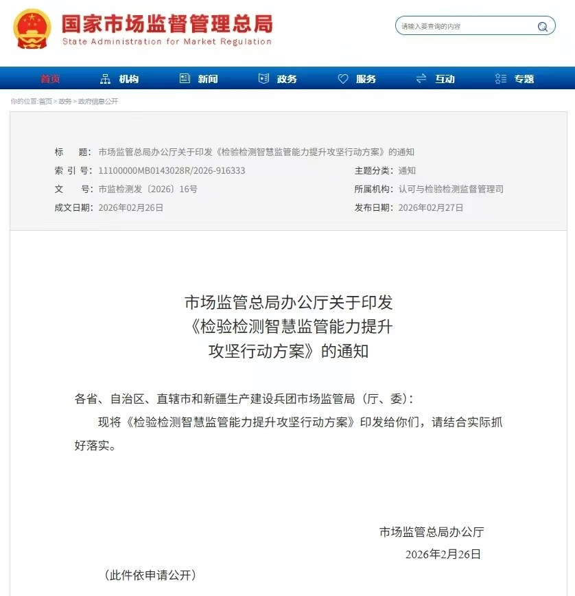 提出力争到2027年底,全国统一的检验检测智慧监管平台基本建成,数据集成共享全面实现,人工智能、大数据等新技术深度应用,智慧化审评、穿透式监管等新方式广泛推行,上下贯通、左右联通的智慧监管格局有效建立,检验检测监管效能显著提升。